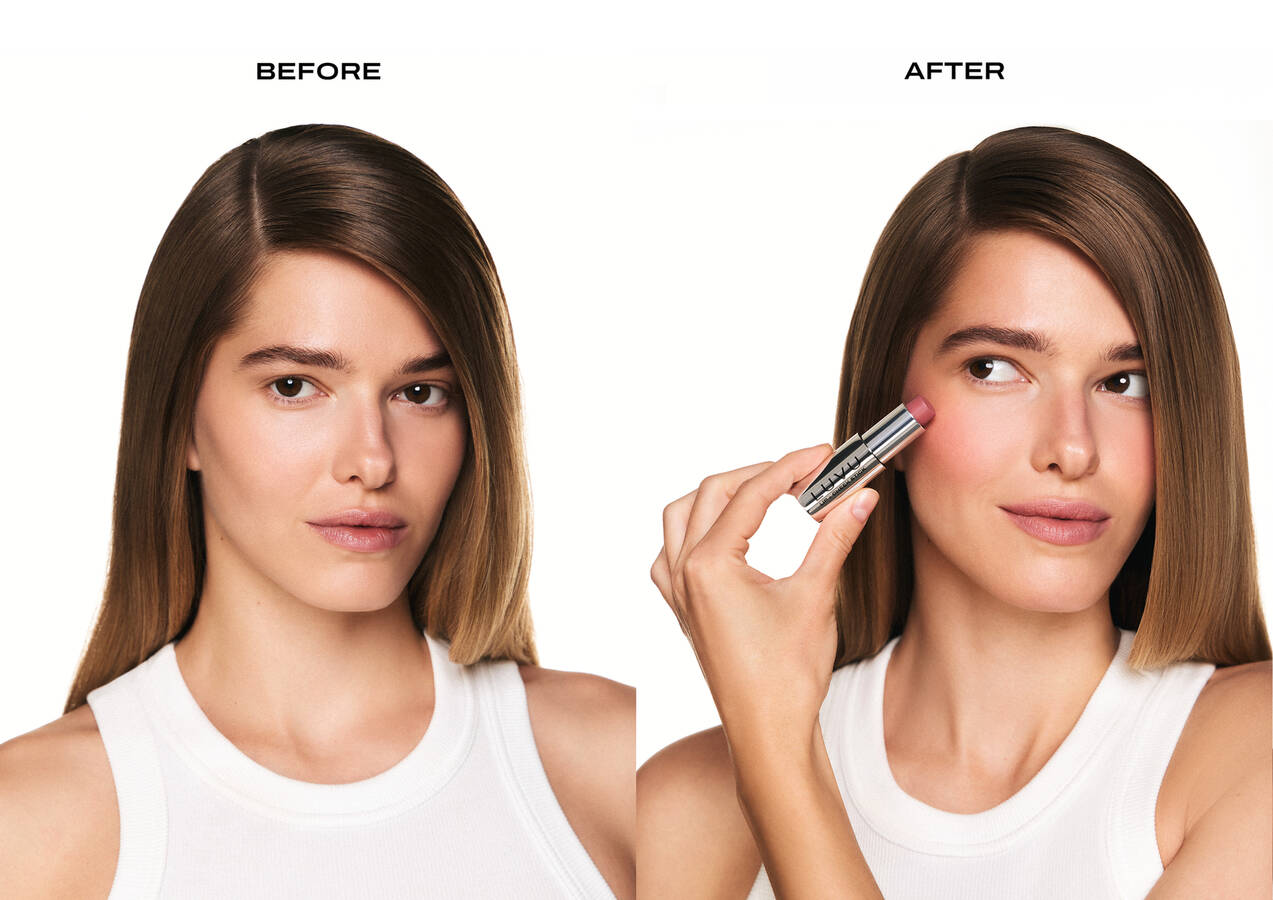 Нанесите небольшое количество продукта и растушуйте кисточкой или кончиками пальцев. Наслаивайте до желаемой интенсивности.